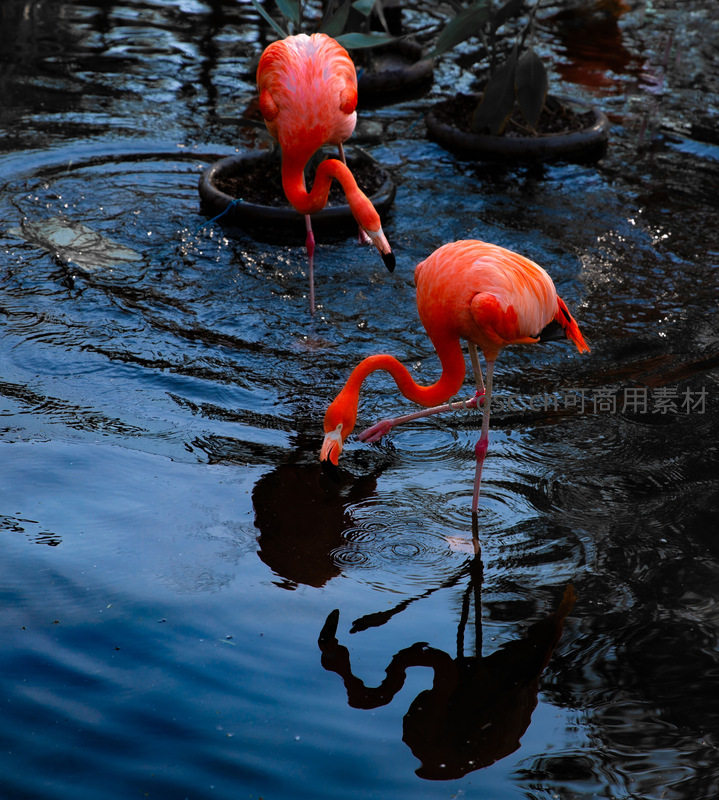 两只鲜艳的火烈鸟在深蓝色的水面上低头觅食,S形的脖颈优雅弯曲,水面荡起涟漪,倒影随之摇曳,展现生动的生态瞬间。