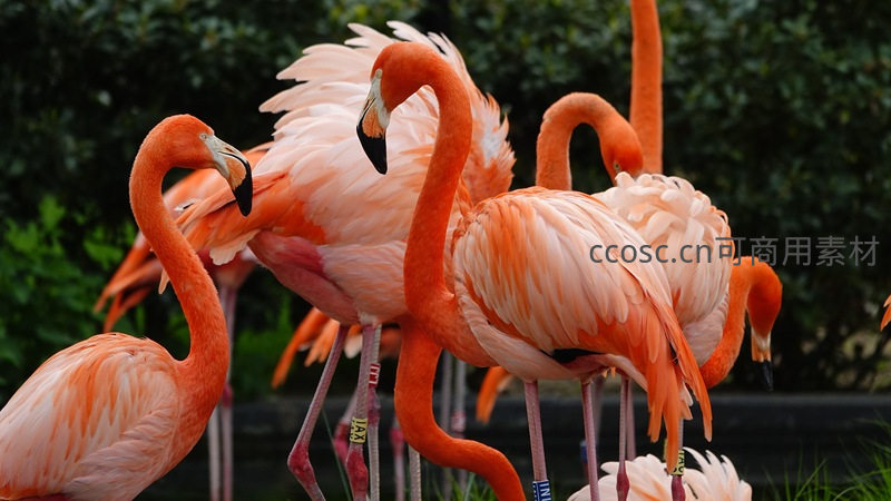 多只火烈鸟聚集在一起,有的梳理羽毛,有的静静站立,粉嫩的羽翼层层叠叠,长腿交错,呈现出温馨和谐的群体生活画面。