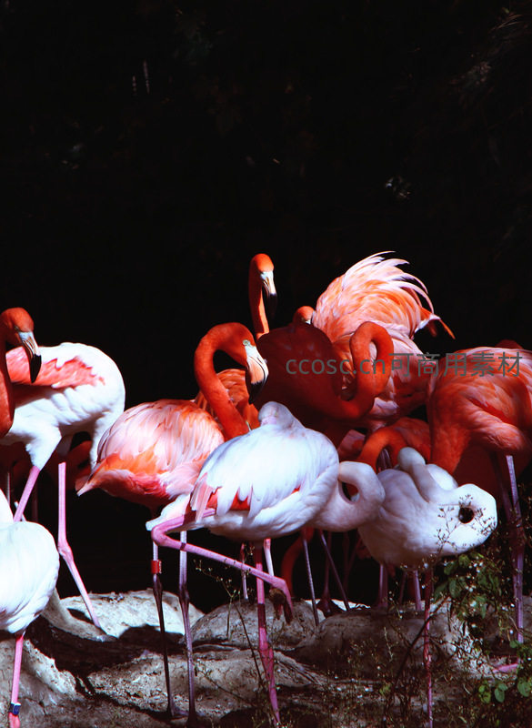 在昏暗背景与聚光灯下,火烈鸟群呈现出鲜明的粉白对比色,姿态各异,光影交错间营造出如舞台剧般的视觉冲击力。