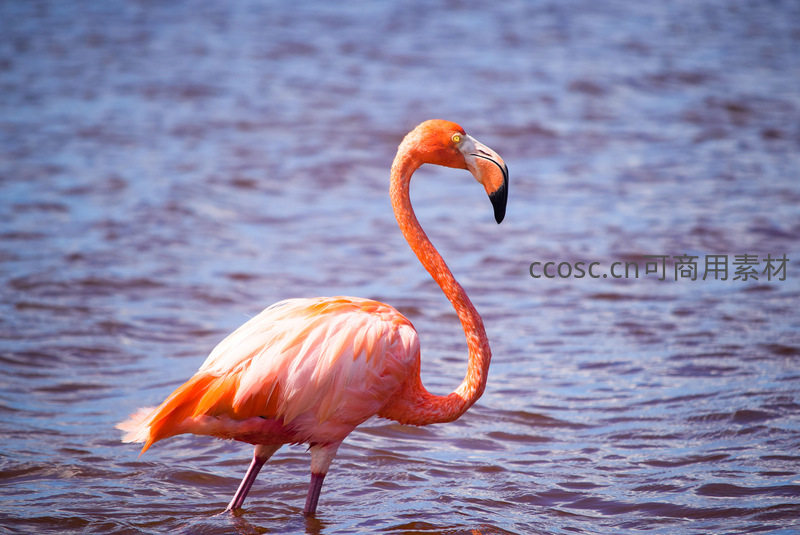 一只火烈鸟在波光粼粼的浅水中缓步前行,修长的脖颈与鲜艳羽毛在柔和光线下格外醒目,尽显其孤傲而优美的姿态。
