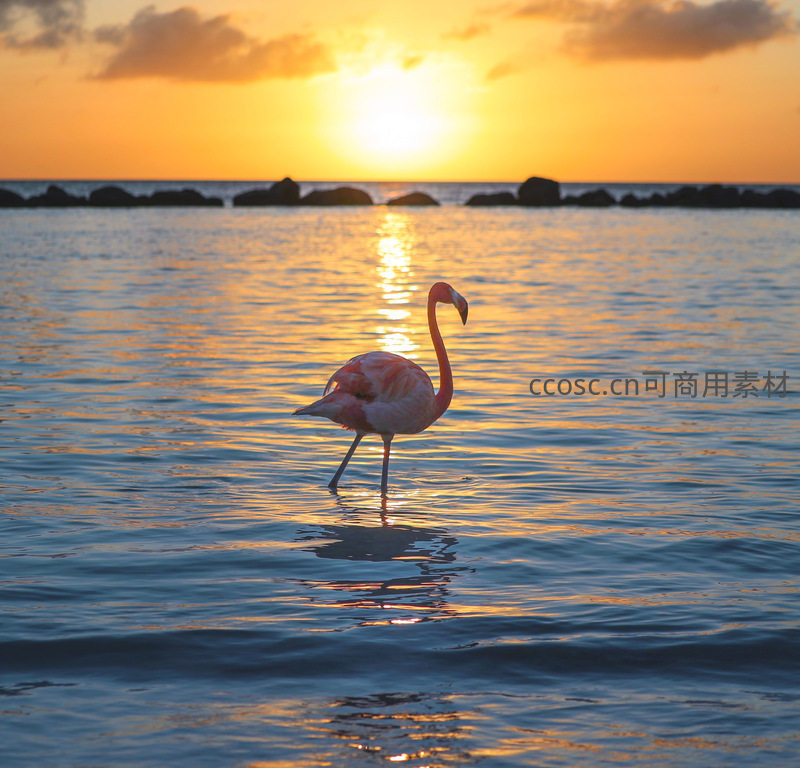 夕阳西下,火烈鸟剪影漫步于金色海面
