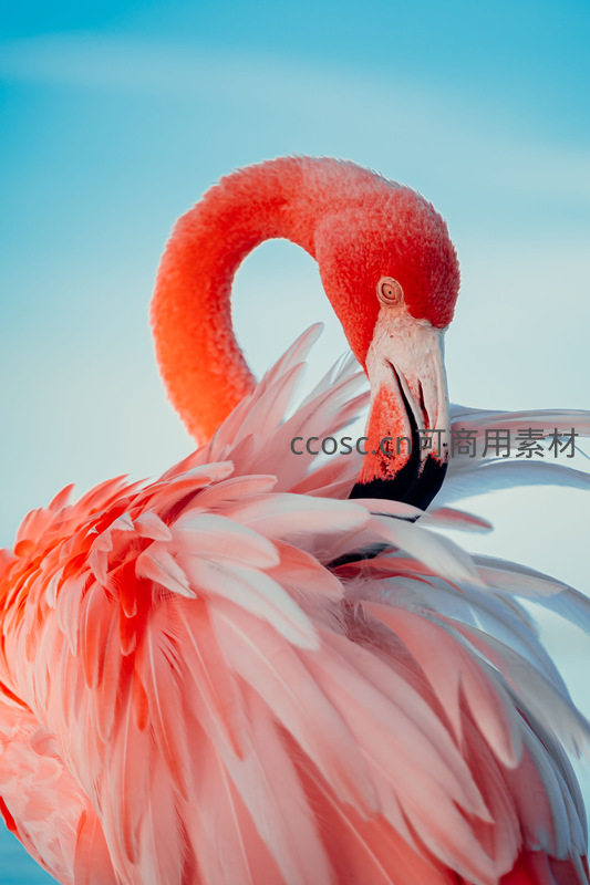 特写火烈鸟柔羽,弯颈如弓,蓝天为幕