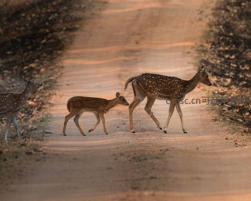 三只梅花鹿穿越土路,夕阳余晖