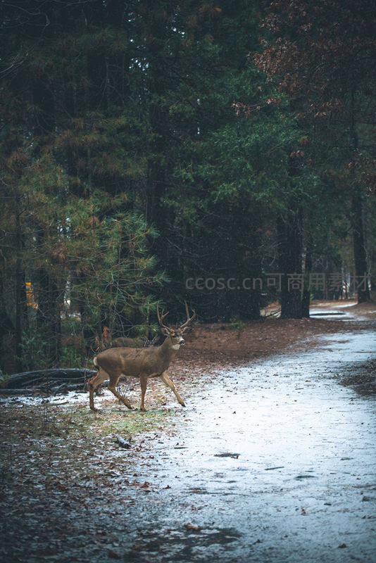 一只鹿在薄雪覆盖的林间小径上缓步前行,四周树木肃穆,落叶铺地,营造出冬日森林的静谧与诗意。