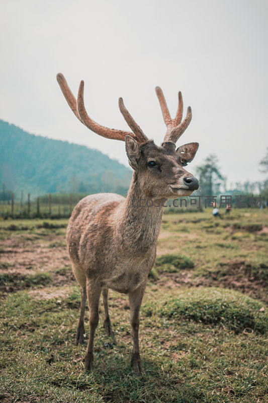 一只长角雄鹿站立在广袤的草地上,背景是连绵起伏的青山,展现出其威武姿态和大自然辽阔壮丽的原始风貌。