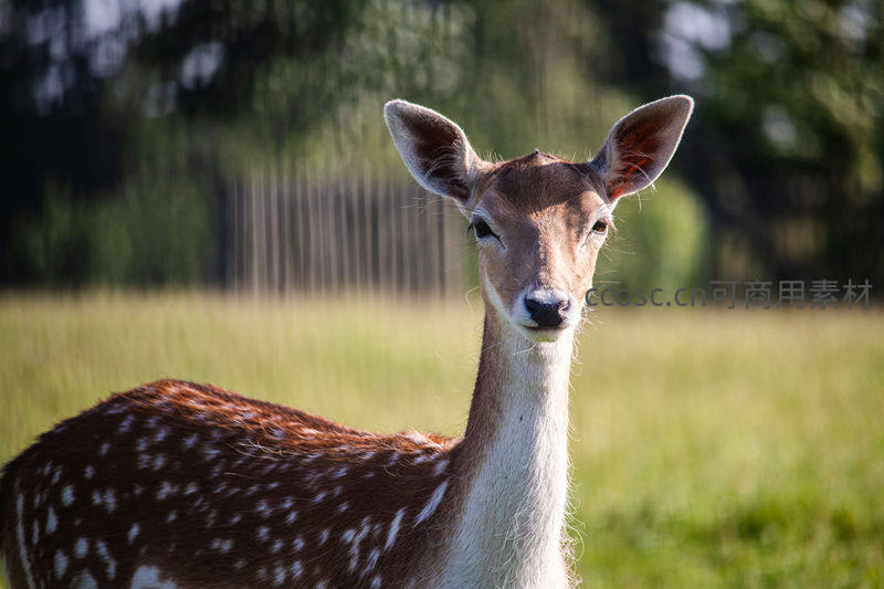 一只拥有白色斑点的梅花鹿站在翠绿草地上,耳朵警觉竖起,眼神清澈温柔,背景是模糊的树林,充满宁静与自然之美。