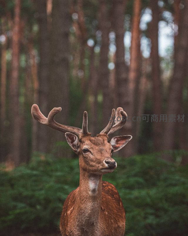 一只雄壮的梅花鹿伫立在幽深的松林中,背景是模糊的树干与绿植,眼神专注而温柔,展现出自然界的宁静与野性之美。