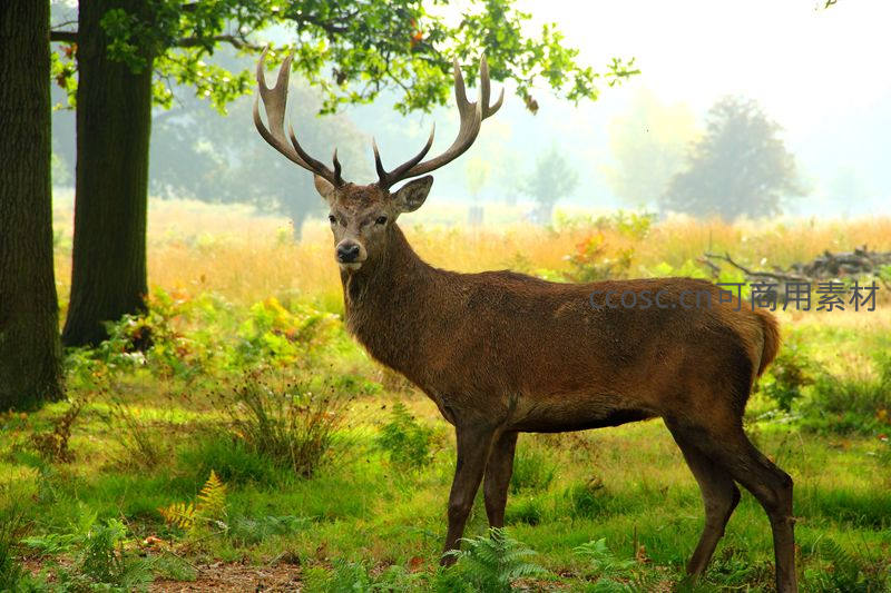 薄雾笼罩的清晨,一只雄鹿昂首挺立在绿意盎然的林间空地,阳光穿透树叶洒在其身上,宛如森林之王,散发着沉稳与高贵的气息。