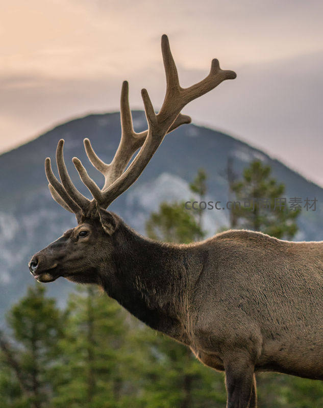 一只雄壮的麋鹿伫立在山巅,巨大的鹿角在柔和的暮色中勾勒出清晰轮廓,背景是连绵起伏的远山,尽显王者风范。