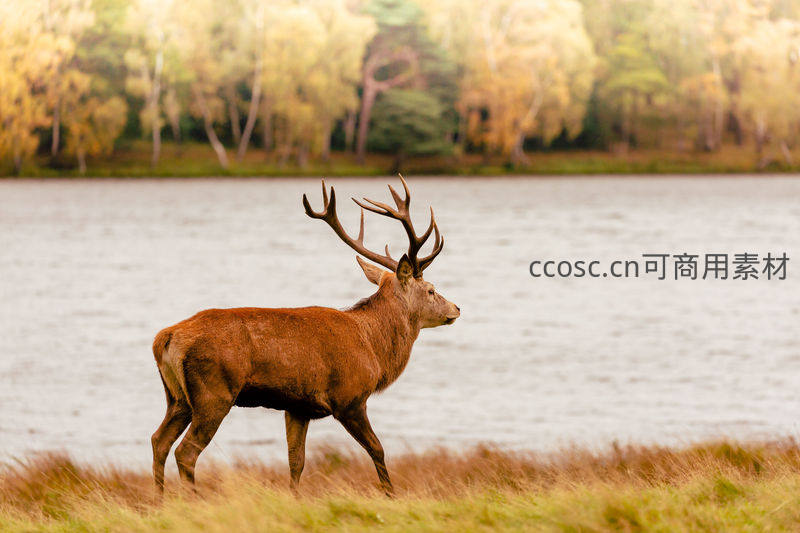 一只雄鹿沿着湖岸缓步前行,身后是金黄的秋林倒映在平静水面,暖色调光影交织,构成一幅和谐优美的自然画卷。