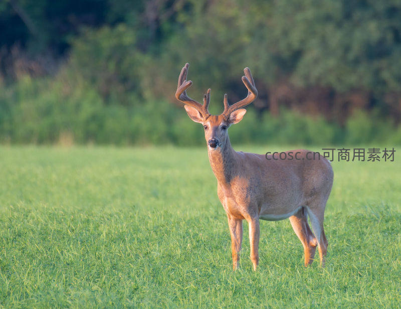 一只健壮的雄鹿站立在广阔无垠的绿色草地上,背景是茂密的树林,阳光洒落,营造出宁静祥和的自然氛围。