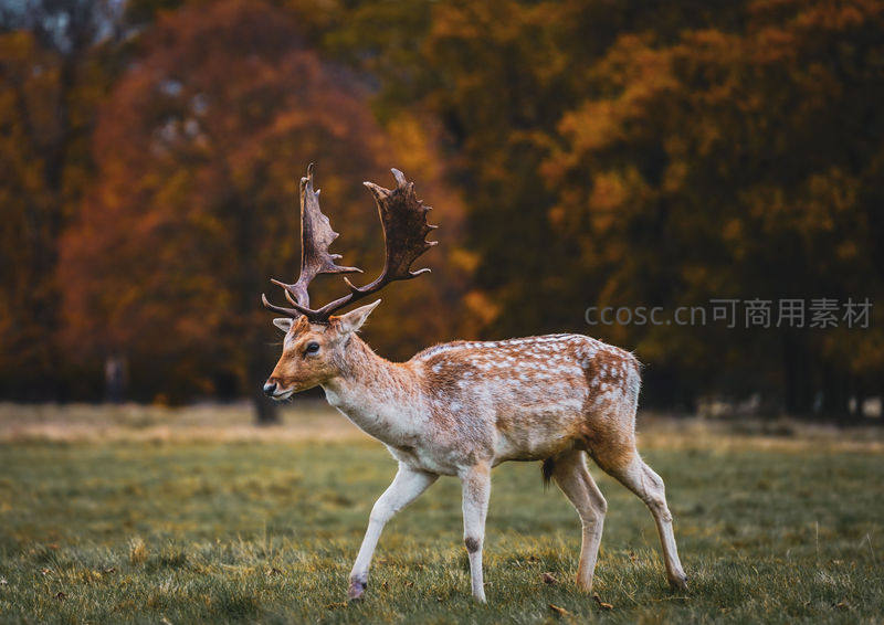 一只拥有独特斑点皮毛的鹿在秋日的草地上缓步前行,背景是色彩斑斓的树林,营造出宁静祥和的季节感。