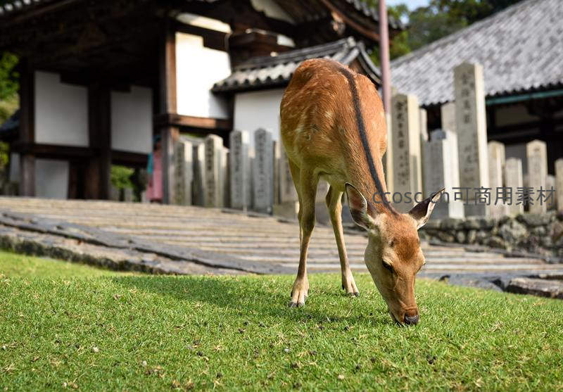 在传统日式寺庙庭院的石阶前,一只温顺的小鹿正低头专注地吃着青草,背景是庄严的建筑和石碑,营造出人与自然和谐共处的氛围。