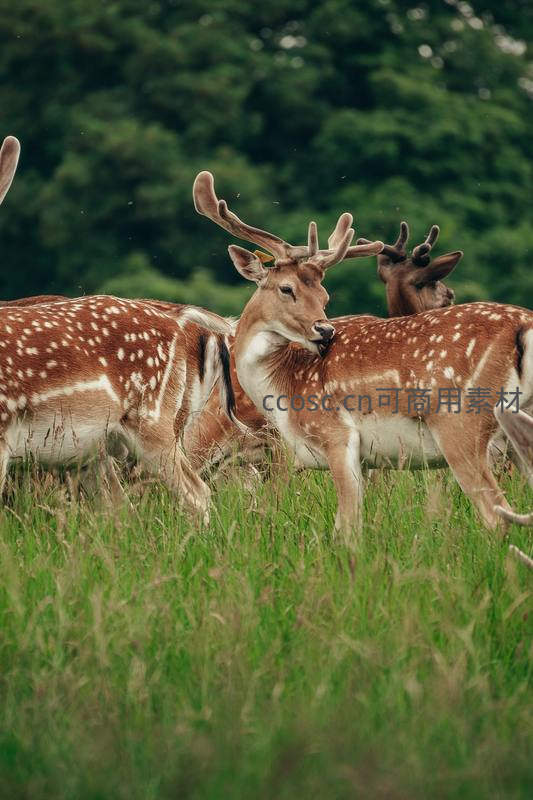 一群梅花鹿在青翠的草地上悠闲踱步,背景是茂密的森林,画面宁静而充满生机,展现了动物与自然和谐共处的美好瞬间。