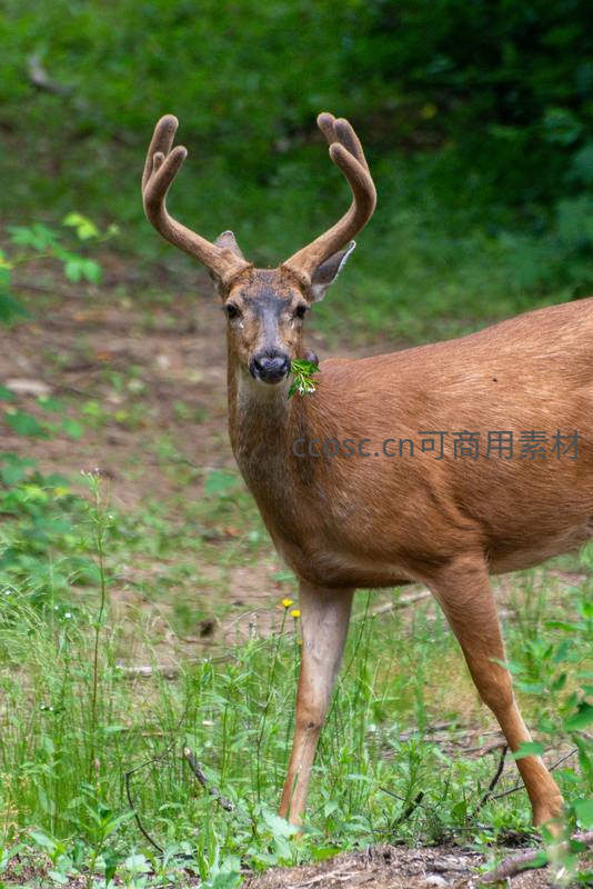 一头健壮的雄鹿在林间小径上驻足,口中含着新鲜绿叶,眼神专注,周围植被繁茂,充满生机与野性之美。