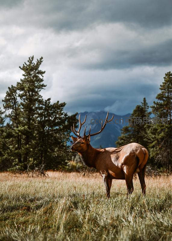 乌云密布的天空下,一头麋鹿昂首站立于金黄草甸中,松林环绕,远山若隐,营造出紧张而壮丽的自然戏剧感。