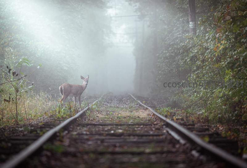 一只小鹿伫立在被浓雾笼罩的废弃铁轨上,四周是茂密的树林,阳光穿透薄雾洒下柔和光束,营造出如梦似幻的氛围。