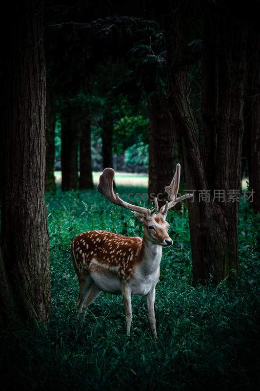 一只拥有巨大鹿角的梅花鹿站在幽暗森林的绿色草地上,高大的树干环绕四周,它警觉地望向一侧,尽显野性之美。