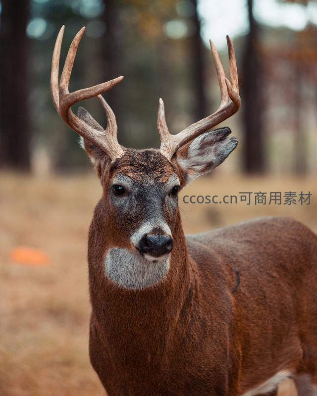 镜头聚焦于一只雄壮白尾鹿的脸部,它巨大的鹿角和深邃的眼神充满力量,背景是模糊的秋日林地,尽显王者风范。