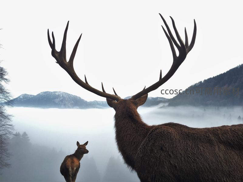 在云雾缭绕的山巅,一只巨大的雄鹿背对镜头,身旁幼鹿仰望,构成一幅壮丽而温情的自然画卷。