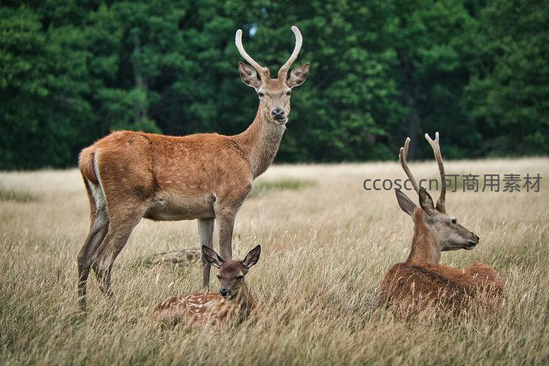 在广阔的金色草地上,一只成年雄鹿与幼鹿和雌鹿相伴,展现出自然界的宁静与家庭的温情,背景是茂密的森林。