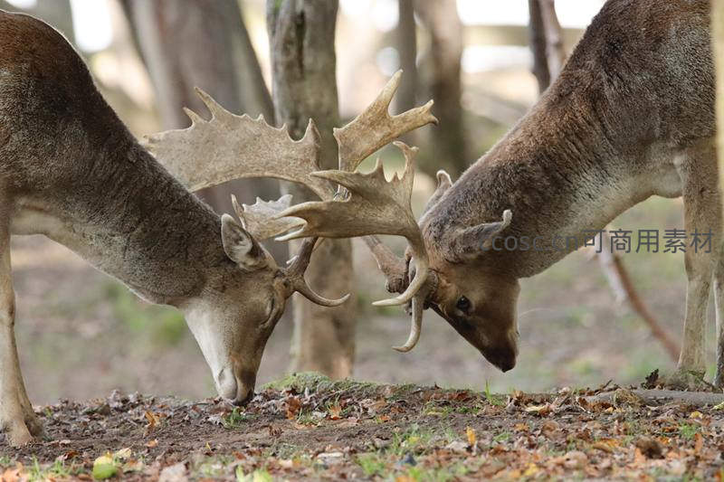 两只雄鹿在林间空地低头角力,巨大的鹿角交错碰撞,展示着野性的力量与生存竞争,背景是模糊的树木和落叶。