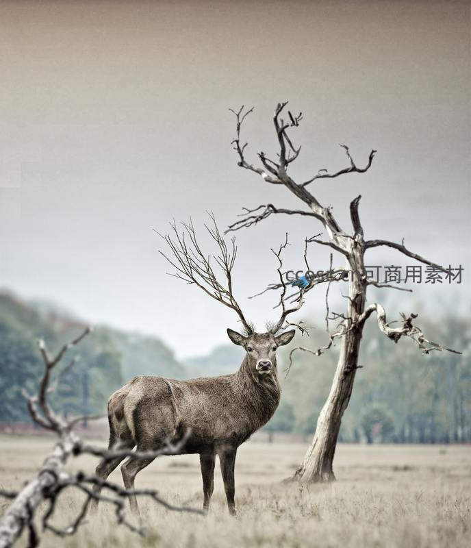枯树旁雄鹿静立远眺