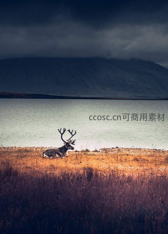 一只驯鹿卧于湖边枯草之上,远山乌云压顶,湖面平静如镜,营造出苍凉而诗意的北国黄昏氛围。