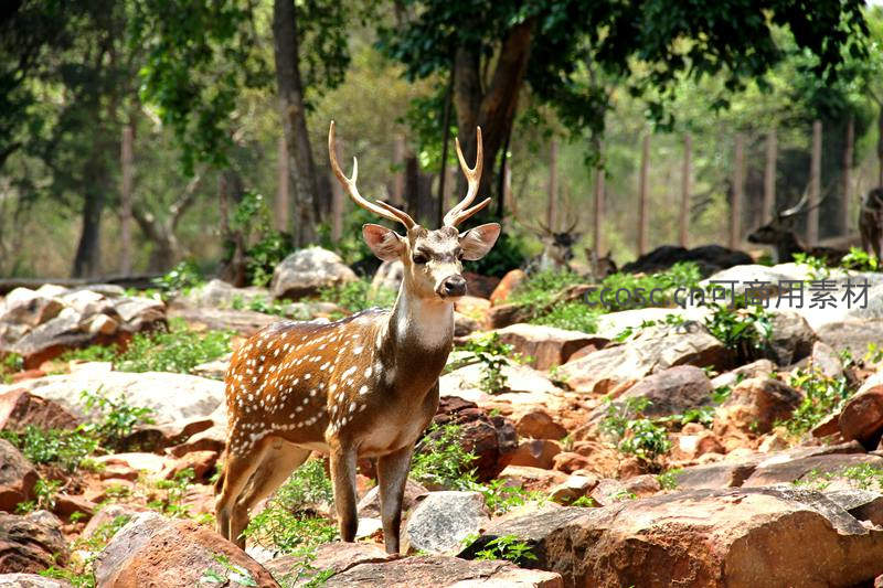 一只成年斑鹿站立在布满红褐色岩石的林地间,背景是郁郁葱葱的树木和柔和的阳光,展现出宁静而生动的自然生态画面。
