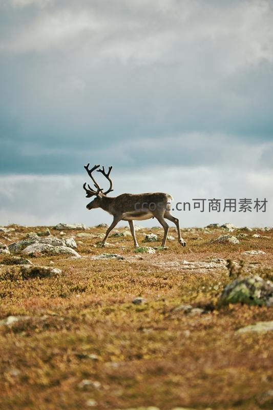 苔原上独行的驯鹿,天空阴云密布
