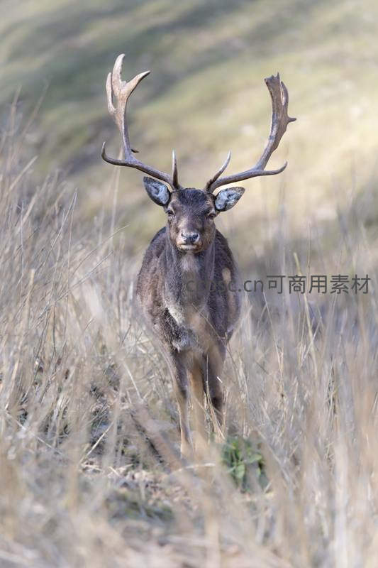 一头雄鹿站在枯黄的草丛中,直视镜头,眼神充满野性与警觉。它健硕的身躯和分叉的鹿角,在柔和的光线下显得格外英武,尽显王者风范。