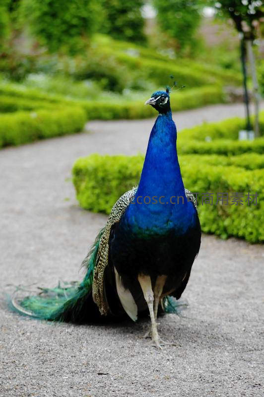 孔雀漫步花园小径,身后拖曳华丽尾羽