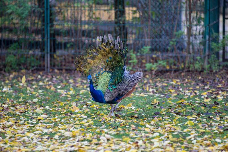 秋日公园中孔雀开屏漫步落叶铺满草地