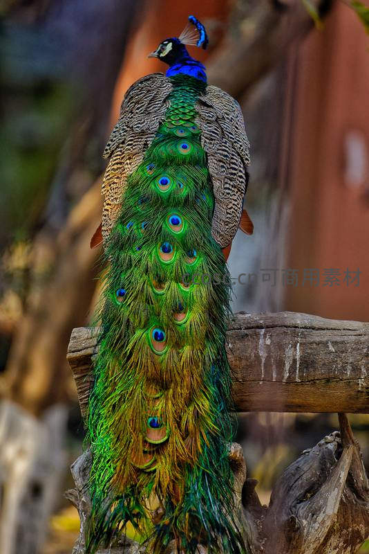 从后方拍摄的孔雀,其修长而艳丽的尾羽垂直垂下,覆盖在粗糙的木桩上,翠绿、金黄与宝蓝的色彩层次分明,充满视觉冲击力。