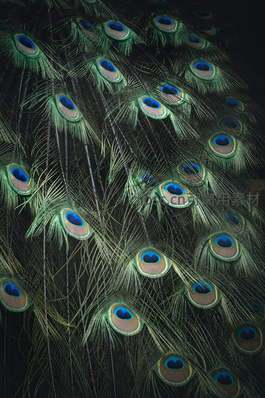 近距离聚焦孔雀尾羽上的“眼斑”,在幽暗背景下,每一个由蓝、绿、金构成的眼状图案都清晰可见,宛如神秘的宇宙星云。
