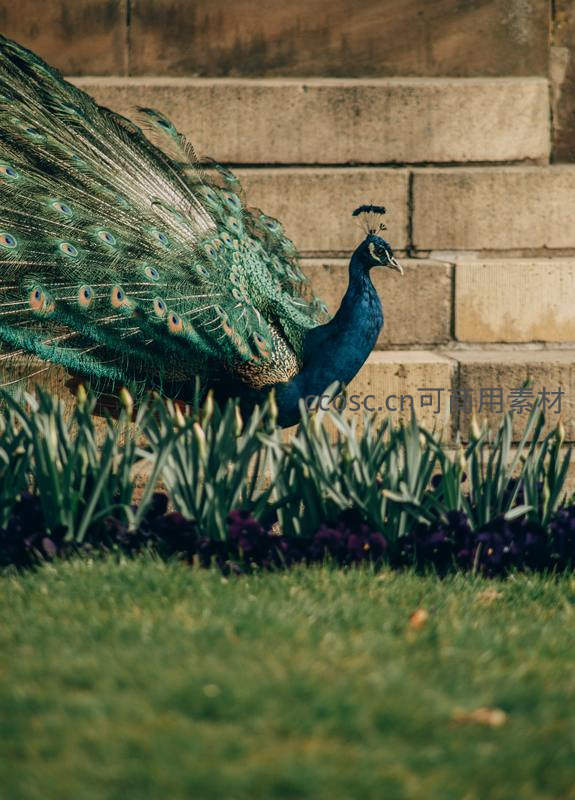 一只孔雀在古典石阶旁的绿茵花丛中悠然踱步,它那长长的尾羽轻拂过地面,为宁静的庭院增添了一抹生动而高贵的色彩。