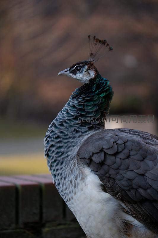 这是一只雌性孔雀的侧面特写,其羽毛以灰褐色为主,点缀着细腻的纹理,虽不似雄鸟华丽,却透出一种内敛、沉静的自然之美。