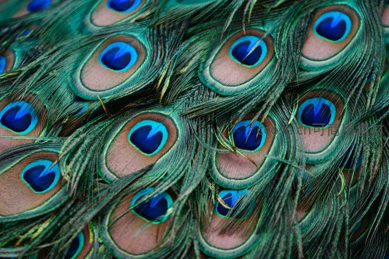 镜头拉近,孔雀尾羽上的眼斑图案清晰可见,深蓝、翠绿与金棕交织,每一根细羽都如精密的艺术品,展现生物结构的精妙与色彩的魔力。