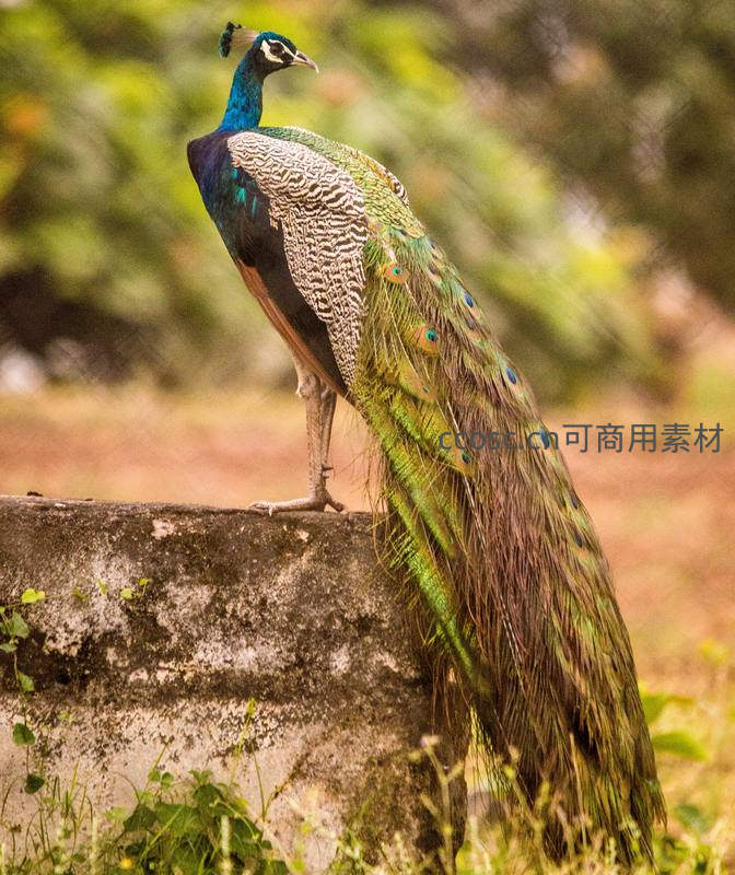 蓝绿羽翼的孔雀优雅伫立石墙之上