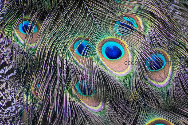 近距离捕捉孔雀尾羽上的眼状斑纹,每一片羽毛都呈现蓝、绿、金、紫交织的虹彩光泽,细腻纹理与层次感令人惊叹自然造物之精妙。