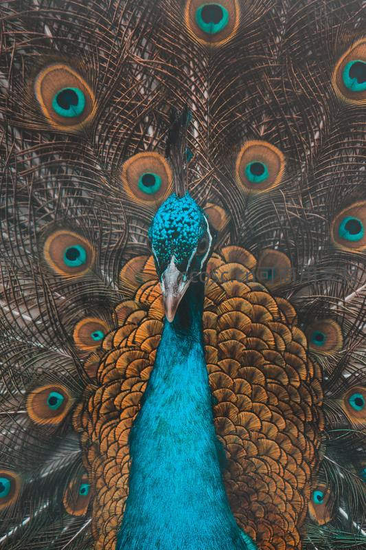 孔雀以正面姿态完全开屏,深蓝头部与铜棕色颈部形成强烈对比,无数眼斑如盾牌般环绕,目光锐利直视镜头,气势磅礴不容忽视。