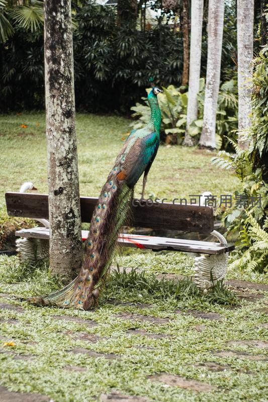 孔雀静立于木质长凳之上,身后是郁郁葱葱的棕榈树与灌木丛,阳光透过叶隙洒落,勾勒出一幅人与自然共处的诗意画面。