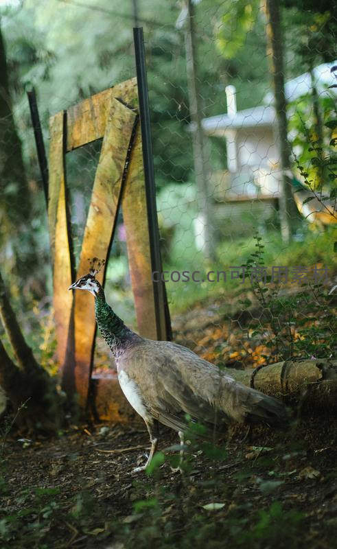 一只孔雀在郁郁葱葱的林间小径上悠闲漫步,背景是模糊的绿植和木制结构,展现出人与自然和谐共处的宁静画面。