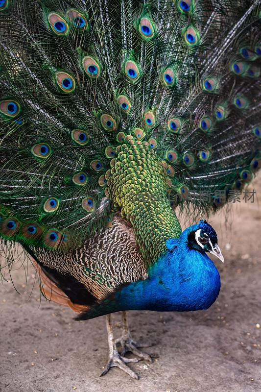 孔雀昂首挺胸,展开如扇般绚丽的尾屏,蓝绿相间的羽眼在阳光下熠熠生辉,彰显其无与伦比的王者气度。