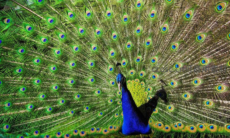孔雀展开巨大的尾屏,无数“眼睛”图案在翠绿底色上绽放,如同一个由光与色彩构成的神秘宇宙,展现了自然界最令人惊叹的求偶艺术。