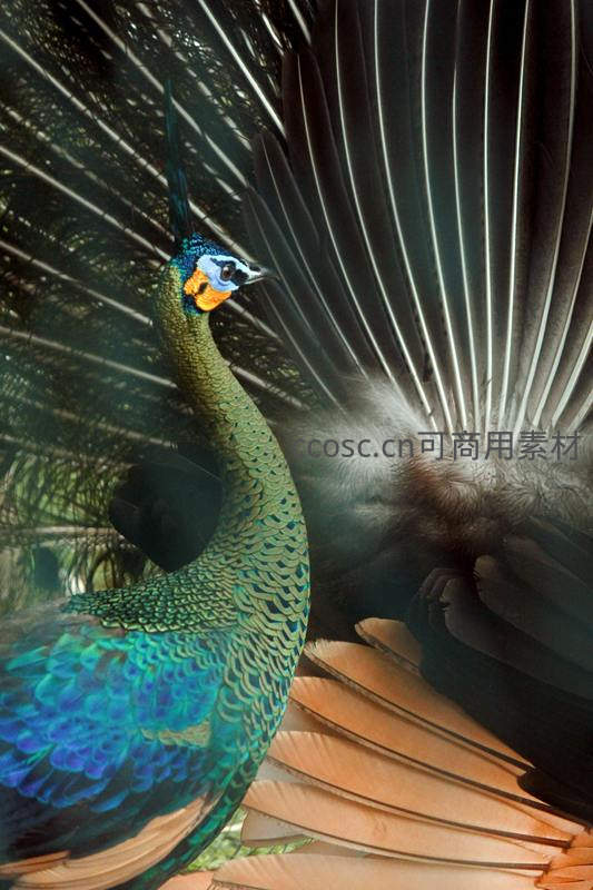侧影孔雀展翅,光影交织羽翼细节