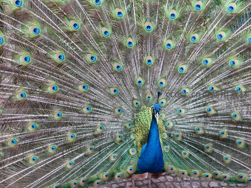 孔雀昂首挺立,尾羽如巨大的扇面铺展,每根羽毛上的眼斑都熠熠生辉,在阳光下闪耀着金属般的光泽,令人叹为观止。