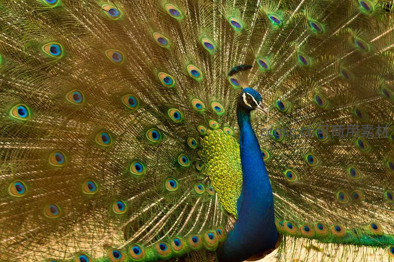 在温暖的金色光线下,孔雀昂首挺胸,完全展开的尾屏如同一把巨大的扇子,蓝绿相间的“眼斑”在金黄背景下格外醒目,尽显王者风范与自然之美。
