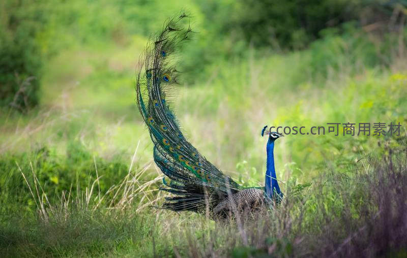 孔雀开屏展华羽,眼斑如星,草间舞动