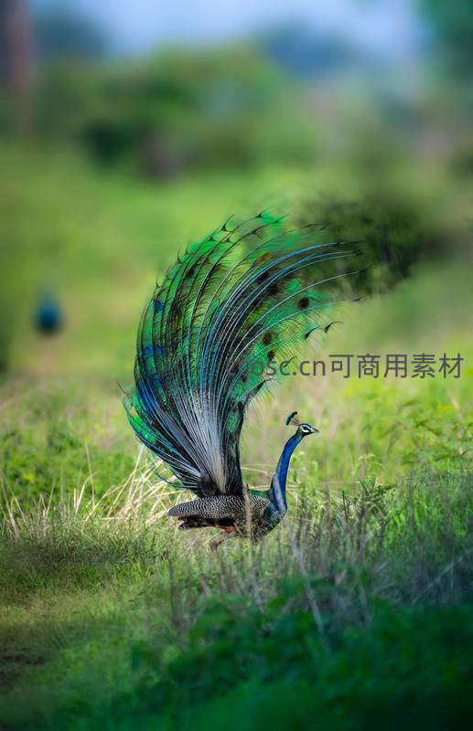 孔雀翩跹舞绿野,尾羽如扇,光影摇曳